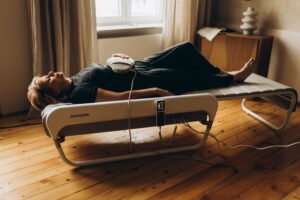 Pozycja leżąca na plecach podczas otrzymywania terapeutycznego masażu termicznego, odpowiednio łagodzi ucisk kręgosłupa i nerwów, co pomaga zmniejszyć stan zapalny i napięcie mięśni.